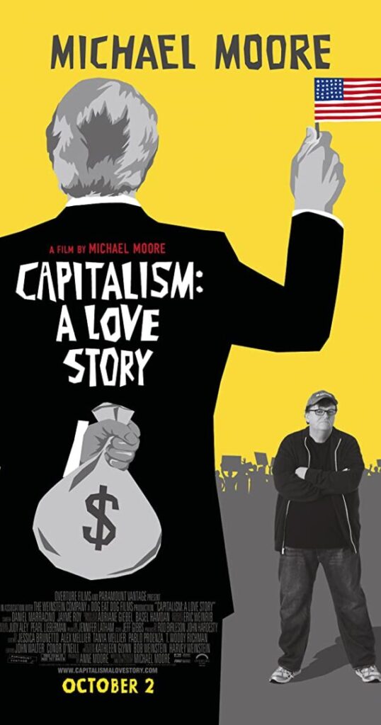 In today’s rousing review of At the Movies, we are taking a look at noted documentary filmmaker Michael Moore as he once again takes a croquet mallet to some of society’s more complex issues in a documentary known as Capitalism: A Love Story. Indeed this is a film that chooses to put a magnifying glass, with varying degrees of both harshness and comedy, the spine of the late 2000’s financial system in the United States. Indeed long considered one of the world of filmmaking’s more controversial individuals, the long-time resident of Flint, Michigan known just as much for his casual fashion sense, and his iconic baseball cap as he is for his divisive and take-no-prisoners takes on everything from the healthcare to firearms industries has now set his sights on the United States’ system of capitalism. Indeed often adored by the left, and crucified by the right, Moore has never been one to hesitate showing his own point of view through his filmography, but at least he does insert them in films that are both extremely well put-together and quite often very engaging in how it is delivered to an audience even if every person in said audience may not agree at any time with any point that he chooses to deliver. Though to be fair I do believe that an individual’s set of beliefs have always been on hand to influence pretty much any movie that the viewer chooses to watch. With this film however, the ball is in Moore’s court to deliver a quality product to movie goers who may or may not have made up their minds even before sitting down to watch. Thus from an objective, mid-way perspective, as you have come to expect from me over the course of over 200 reviews for this site, the question becomes: does Moore triumph in getting his message across in a manner that will persuade even his harshest critic, keep the faith with his supporters, and actually convince the middle of the road people like myself that his side is “right”? As always with Moore, who most certainly has never been one to make things easy for himself, the answer is both yes and no.
