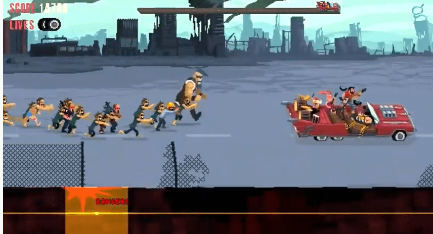 So the band jams in the car while looking for a place to get gas, while being chased of course by their adoring zombie fans. You play along with the band hitting notes with your controller which allows you to shoot and kill those zombies.