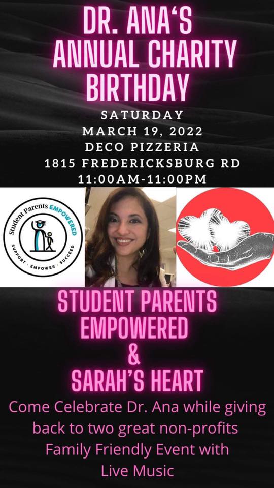 Every year, Dr. Perez-Potthast dedicates her birthday celebration to help bring awareness to charities in the San Antonio. Her birthday parties have brought presents to local charities in need such as perishable items, monetary donations, and much more. This year, she will continue the tradition of her birthday with 2 charities chosen for the event. The will be live bands, hip hop performers, and Star Wars cosplayers honoring the late Robert Rodriguez Jr.