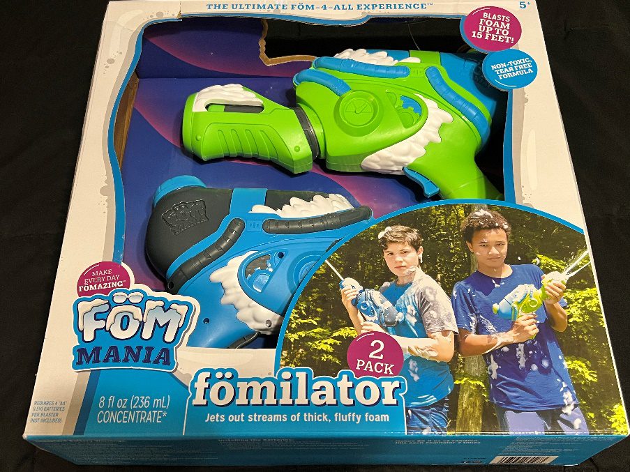 - The Fomilator came with a 2 pack of guns to shoot foam at each! The foam was safe as it didn’t stain or hurt our skin and we were able to move around a lot! My son and I played against each other with a little game we came up with and then we handed off our guns to my daughter and wife after we calculated a score. They all had fun with these guns! They are safe, lightweight and made us run a lot! This product provided us a ton of exercise as well as a way to have fun with each other!