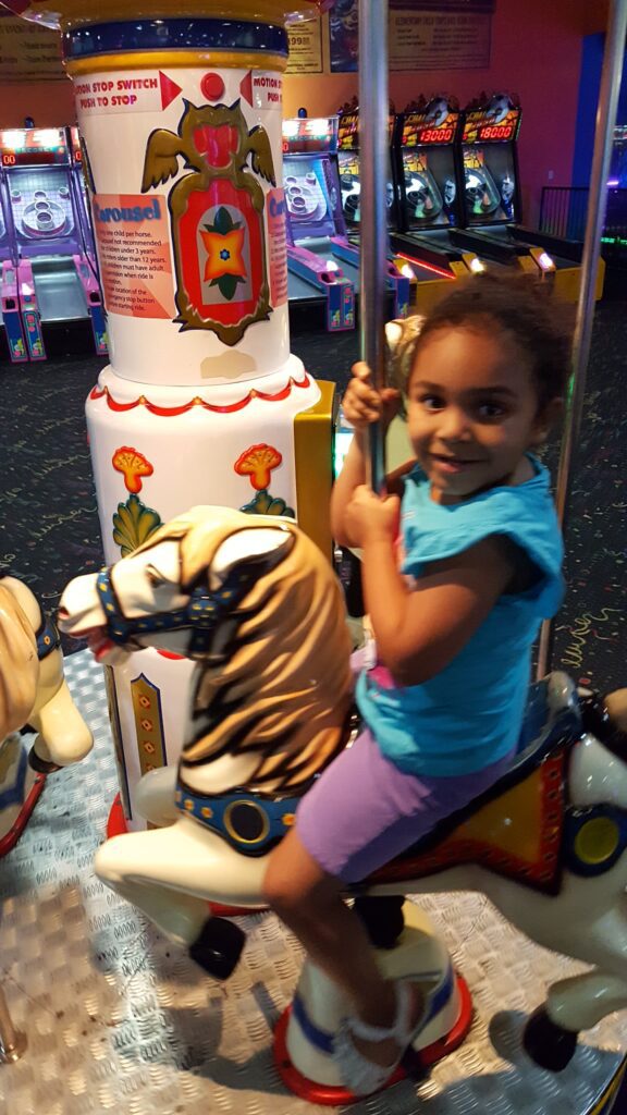 After we ate, we went to check out the game room and try out the many games they had there. I was able to win the jackpot a few times and we had so much fun. My daughter had to take ride on the horses because she said they are there for her to ride.