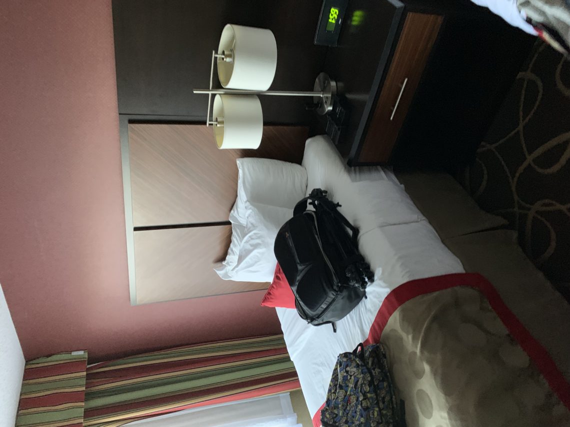 We got to the hotel and looked pretty nice. There is a 24 hour little shop in side with food, cake, drinks, snacks and more. There is also a restaurant and bar there that had some good options for eating and drinking. The staff were very nice to check us in and got us in the room quickly. The room had ample space and we each had a bed for us in our room.