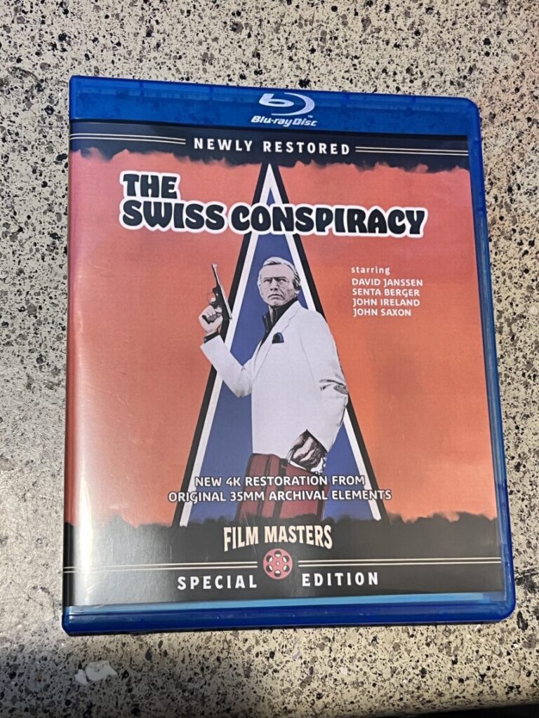 We were able to get a review copy of the movie The Swiss Conspiracy on Blu Ray. The movie came stacked with a booklet that included behind the scenes pictures and information of the movie during that time as well bonus features. With The Swiss Conspiracy restored for Blu Ray tech, the movie has held up pretty high for these standards. The Bonus features even included a restored trailer from 1976 that will shiver your timbers!